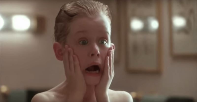 yönetmen chris columbus, bir röportajda , culkin'in sadece biraz parfüm sıkıp bağırması gerektiğini söyledi. ancak bunun yerine, bağırdığı süre boyunca ellerini yüzünde tuttu ve bu da onu ünlü edvard munch tablosu "çığlık"a benzetti. culkin'in fikri mükemmeldi, bu yüzden filmde kaldı.