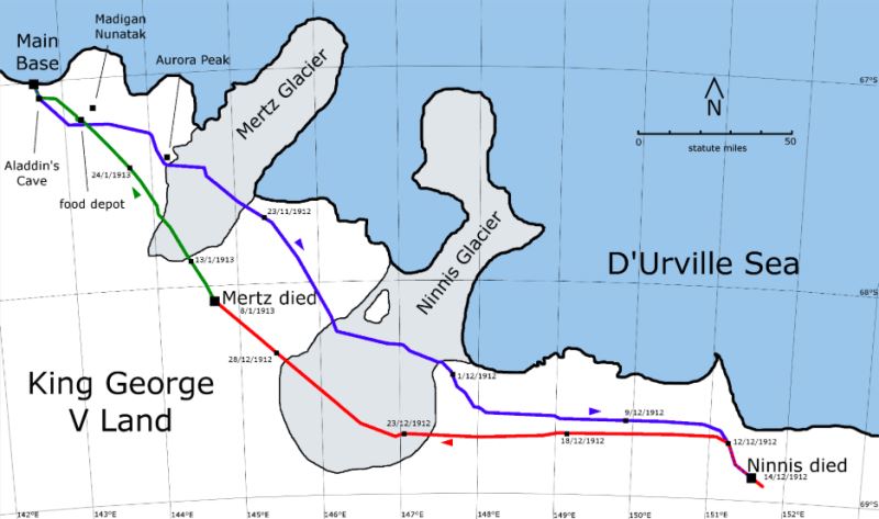 böyle bir yolculukta, xavier mertz ve belgrave ninnis eşliğinde mawson, buz üzerinde tehlikeli bir yürüyüşe başladı. üçlü haftalarca trajedi vuruncaya kadar kızak köpekleriyle ilerledi. ninnis, hayati malzemeler ve altı kızak köpeği ile gizli bir yarık içine düştü. çaresizlik mawson ve mertz'i kızak köpeklerini yiyerek hayatta kalmaya zorladı, ancak bu korkunç önlem bile yeterli değildi. mertz hastalandı ve öldü, mawson'u yalnız yolculuğa bıraktı. açlık, bitkinlik ve acımasız soğukla mücadele ederek 30 gün daha trekking yaptı.