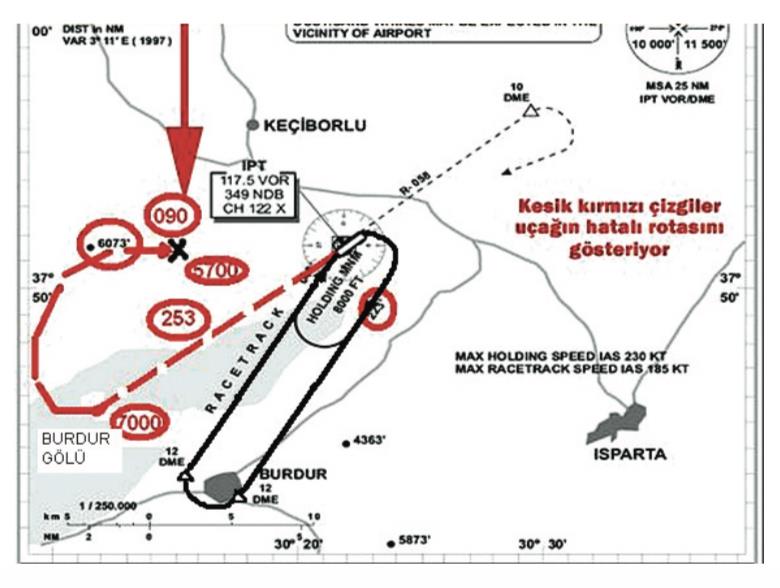 pilotlar 223 dereceden 193 dereceye dönmeleri gerekirken tam aksi istikamete 30 derece hatalı olarak 253 dereceye dönmüşlerdir. kaynak: ünal başusta