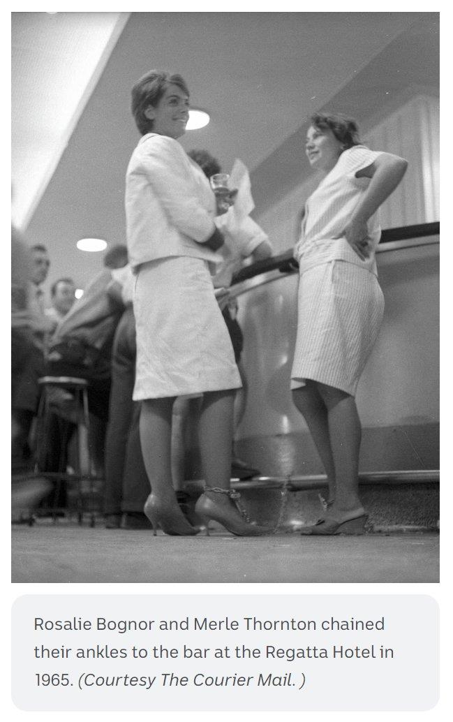 mart 1965'te bir çarşamba günü öğleden sonra iki akademisyen, merle thornton ve meslektaşı rosalie "ro" bognor, queensland, brisbane'de bulunan regatta otelinin pubına girip birer limonata sipariş ederler. kadınlara içki servisi yapılmasının otel aleyhine para cezasıyla sonuçlanabileceği gerekçesiyle hizmet verilemeyeceği ve ayrılmaları istendiğinde ise merle ve ro kendilerini barın ayak korkuluğuna zincirlerler. aslında bir protesto eylemi gerçekleştirmektedirler çünkü 1960'larda queensland'deki herhangi bir otelin halka açık barında kadınlara hizmet verilmesi yasa dışıdır.