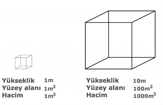 kare küp yasasını daha iyi anlayabilmek için bir kenarının uzunluğu 1 metre olan bir küp hayal edin. yükseklik 1 metreden 10 metreye çıkacak olursa, yüzey alanı 1 metrekareden, 100 metrekareye, hacmi ise 1 metreküpten 1.000 metreküpe çıkar.