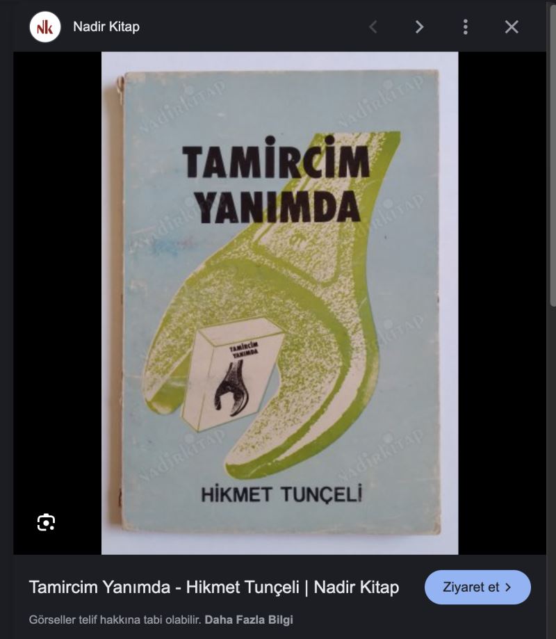 internete yazdım. gerçekten de bir sahafta böyle bir kitap görünüyor ama alma tuşu falan yok. sadece fotoğrafı var. adı: tamircim yanımda. babamın ismi var kapakta falan. kapak çok tuhaf renklerde ya da üzerinden 45 sene geçtiği için renkler bu hale gelmiş artık bilemiyoruz.