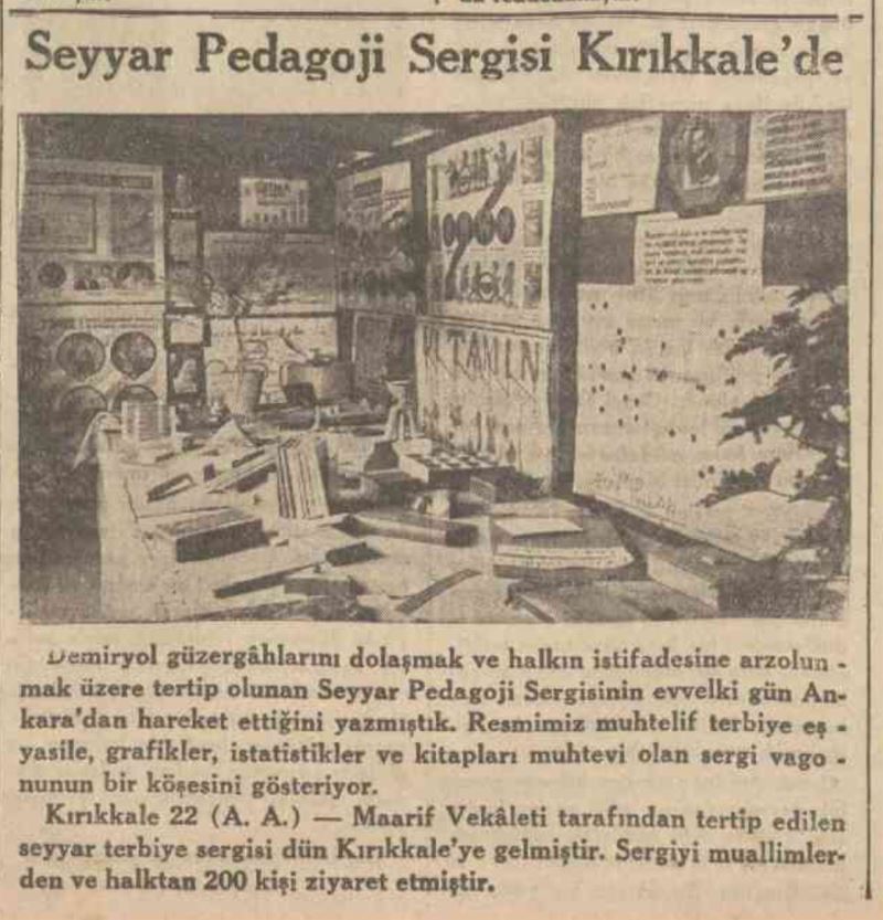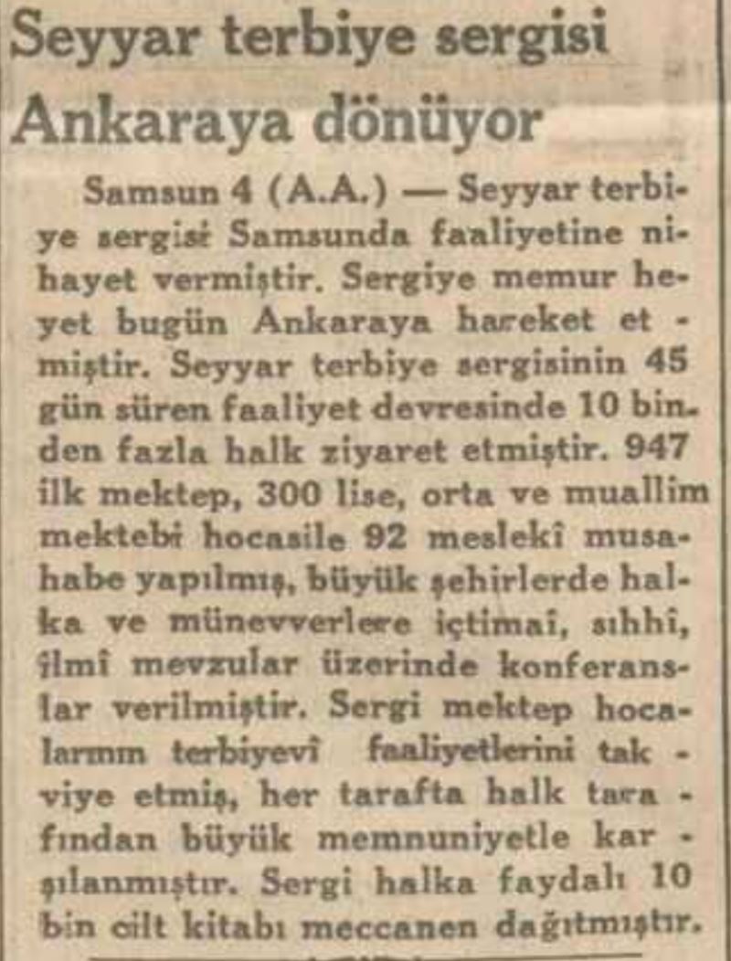 "seyyar terbiye sergisi bugüne kadar binlerce halk, talebe, muallim ve memur tarafından gezilmiştir. ziyaretçilerin kalabalığı nazarı dikkate alınarak teşhir edilen eşya sahile yakın bir mahalde olan istikâl mektebinde halkın ziyaretine açılmıştır. seyyar terbiye heyetinden muallim hayrullah bey resimde, elişinde yeni aletlerin kullanma tarzları hakkında bir tecrübe dersi yapmıştır. doktor celâl bey tarafından mektep terbiyesinde çocuk sıhhati, ismail hakkı bey tarafından iş ve meslek terbiyesi, sadri etem bey tarafından layiklik hakkında birer konferans verilmiştir. reşat şemsettin bey konferansında türk inkılâbının ileriye bakan dünyaya yeni bir şey getirmek istiyen bir milletin inkişafı hakkında şiarlandığını anlatmış ve milli terbiyenin ferdiyet ve cemiyet tearuzlarını kaldıran terkip kıymetine malik olduğunu izah etmiştir. muallimler birliği halkevinde sergi heyeti şerefine bir çay ziyafeti vermiştir ve muallimlere ders filmleri gösterilmiştir."