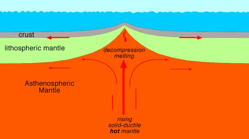 çok basit bir mekanizması vardır. birbirinden uzaklaşan levha sınırlarında, kabuk bu sınır boyunca yırtılıp açılır. bu açıklığı ise alttan gelen magma doldurur. böyle burada sürekli bir şekilde malzeme çıkışı ve birikimi yaşanır. bu bölgelerdeki volkanizma, yırtıklık üzerinden gerçekleştiği için çizgiseldir. bu da dünya'nın okyanus kabuklarının orta kısmında çizgisel yükseltiler oluşturur.