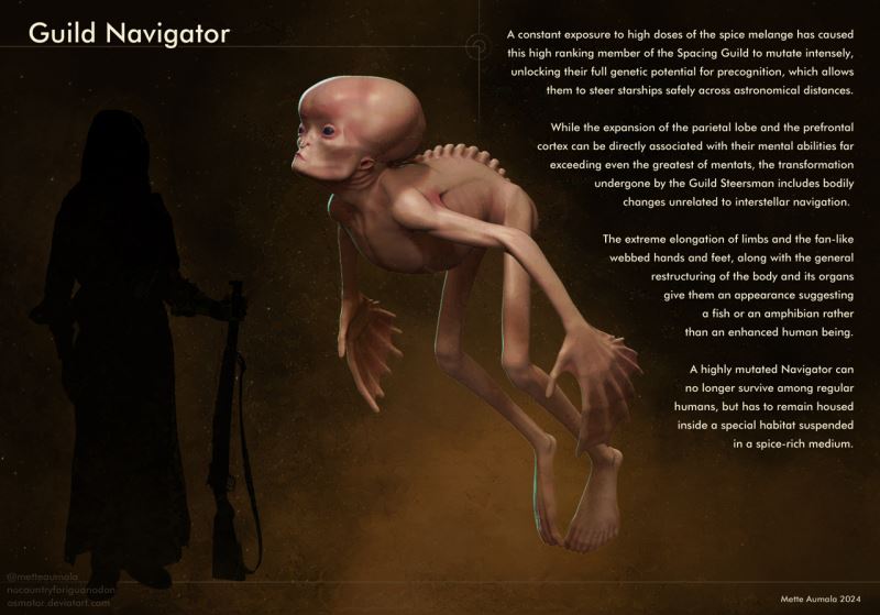 evrim. lonca kaptanları yoğun melanj tüketimi neticesinde deyim yerindeyse fiziksel ve zihinsel olarak tamamen insanlıktan çıkıyorlar. vazgeçiyorlar. çarpık ve bozuk bir görünüme evrilen kaptanların uzuvlarındaki tüm insani yönler de bir bakıma tamamen yok oluyor. sıradan insanın bakış açısıyla kaptanlar deyim yerindeyse bir ucubeye dönüşüyor ve bu sürecin bir geri dönüşü yok. insan sınırları ve yapabileceklerinin limitini görmek açısından bu gerçekten muazzam bir örnek. yıldızlararası seyahati mümkün kılabilmek için (başka sebepler bir yana) mutasyon geçirip tüm insanlığından vazgeçip bir ucubeye dönüşerek bunu mümkün kılabilmek... insanın gerçekten de nutku tutuluyor. normal insan olarak yapamayacağı bir şeyi bozularak ve bambaşka bir şeye dönüşerek gerçekleştirmek... kelimelerin anlamı kalmıyor gerçekten de.