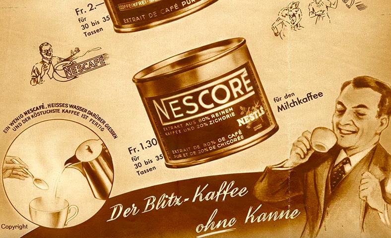 1930’larda brezilya’da kahve üretimi öyle bir patlıyor ki, ellerinde tonlarca kahve stoku kalıyor. bozulmadan saklamak için çözüm aranıyor ve hükümet nestlé’ye başvuruyor. nestlé’nin kimyageri max morgenthaler yıllarca uğraşıyor, kahveyi pratik hale getirecek, uzun süre dayanacak bir yöntem bulmaya çalışıyor. 1938’de isviçre’de ilk “nescafé” ortaya çıkıyor. ismi de nestlé + café birleşiminden geliyor. ii. dünya savaşı sırasında askerler için inanılmaz pratik oluyor: sıcak suya karıştır, kahven hazır. böylece kısa sürede tüm dünyaya yayılıyor.