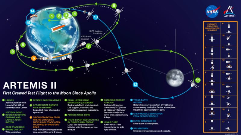 yaklaşık 10 gün sürmesi planlanan artemis 2 uçuşunda, astronotlar ay yörüngesine girip dünyaya geri dönecek. fırlatmanın ardından orion kapsülü önce dünya yörüngesine yerleşirken, astronotlar uzay aracının sistemlerini test edecek, kapsülü manuel olarak uçurarak kritik bazı manevraları deneyecek. bu manevraların sorunsuz atlatılması halinde uzay aracı trans lunar enjection adı verilen aşamaya geçecek ve ay yolculuğu başlayacak. ay'ın çevresindeki flyby uçuşundan sonra da dünya'ya dönüş yolculuğuna geçecek. saatte 40 bin km gibi çok yüksek bir hızla atmosfere girecek aracın pasifik okyanusu'na düşmesi bekleniyor. bu sürecin tamamında aracın navigasyon sistemleri ve özellikle ısı kalkanları test edilmiş olacak.
