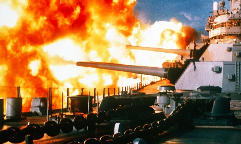 USS New Jersey, Lübnan'ın Beyrut açıklarında bir konuşlanma sırasında 16"/50 toplarından bir salvo atışı yapıyor.