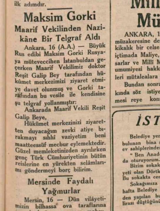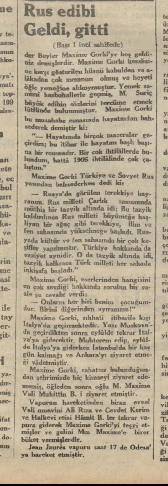 Maksim Gorki'nin 1933 Tarihli İstanbul Gezisine Dair Yerli Gazete Haberleri