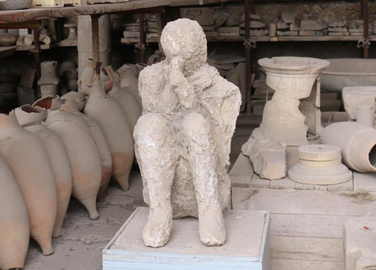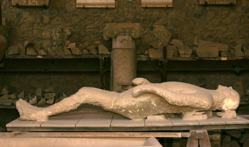 vezüv yanardağı patladığında kurbanlar lavlar altında kalmadı; daha ziyade çok sıcak kül, ponza taşı ve zehirli gaz bulutları (piroklastik akıntı) altına gömüldüler. zamanla bu kül tabakası sertleşti. içerideki yumuşak dokular (et, deri, organlar) yüzyıllar içinde çürüyüp yok olurken, sertleşmiş külün içinde kurbanın vücut şeklini koruyan negatif bir boşluk kaldı. yani ortada taşa dönüşen bir vücut yoktu, sadece bir "vücut kalıbı" vardı.