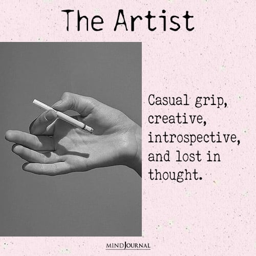 4- sigarayı buradaki sanki yaratıcılığınızın bir uzantısıymış gibi gevşekçe tutuyorsanız sanatçı kişiliğe sahipsiniz denebilir. bu tip, dünyaya genellikle fikirler ve hayallerle dolu, benzersiz bir mercekten bakar. sanatçı, içe dönük ve düşünceli olma eğilimindedir ve sıklıkla kendi düşüncelerinde kaybolmuş veya yaratıcı çabalara dalmış olarak görülebilir.