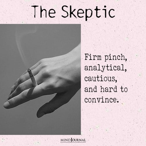 5- sigarayı buradaki gibi sıkıca tutuyorsanız, şüpheci olabilirsiniz. bu tip, temkinli ve analitiktir, sürekli sorgular ve şüphe duyar. olayları olduğu gibi kabul etmezler ve karar vermeden önce durumları iyice incelemeyi tercih ederler. güvensiz veya ikna edilmesi zor görünebilirler, ancak bunun tek nedeni, bir karar vermeden önce sağlam kanıtlara ihtiyaç duymalarıdır.