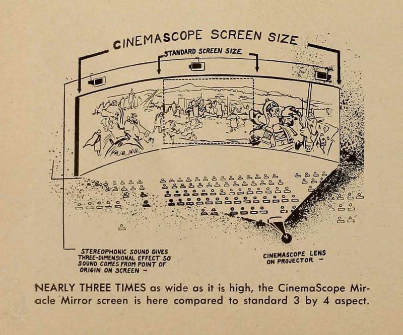 aslında sinemaskop teknolojisinin ortaya çıkışı da tıpkı roadshow etkinliklerinin ortaya çıkışına benziyor. konu televizyonla rekabet yani. izleyiciye baş ağrıtıcı 3d gözlükler olmadan geniş ekranı ve derinlik hissini deneyimletmek zamanla en önemli hedef haline geliyor. zira televizyonun bunu sağlaması pek kolay değil. bu arada evet, o zamanlar da 3d gözlük denen melanet var. ama genelde kısa deneyimler için kullanılıyor. ilk sinemaskop film olan 1953 tarihli the robe filminin sloganı da zaten tüm meseleyi özetliyor: “the first motion picture in cinemascope — the modern miracle you see without glasses!”