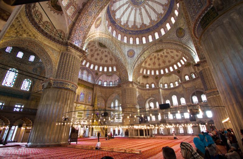 caminin esas olayı iç süsleme. 20.000’i aşkın iznik çinisi var içeride. bitki motifleri, sarı-mavi tonlar, gözünü nereye çevirsen sanat. bu çiniler camiyi sadece ibadethane olmaktan çıkarıp bayağı bir sanat galerisine dönüştürüyor. iç mekan 64x72 metre; kubbe 43 metre yüksekliğinde ve 23,5 metre çapında. kısaca: devasa. içeri güneş girsin diye 200'den fazla renkli cam koymuşlar ve yazıları da dönemin meşhur hattatı diyarbakırlı seyyid kasım gubari yazmış, adam resmen kalemle resital yapmış ve tabii ki sultanahmet camii, türkiye’de altı minareli ilk cami. bu yüzden zamanında “mekke’de bile altı minare var, sen ne yapıyorsun i. ahmed?” diye biraz drama da çıkmış ama sonra çözülmüş o iş.