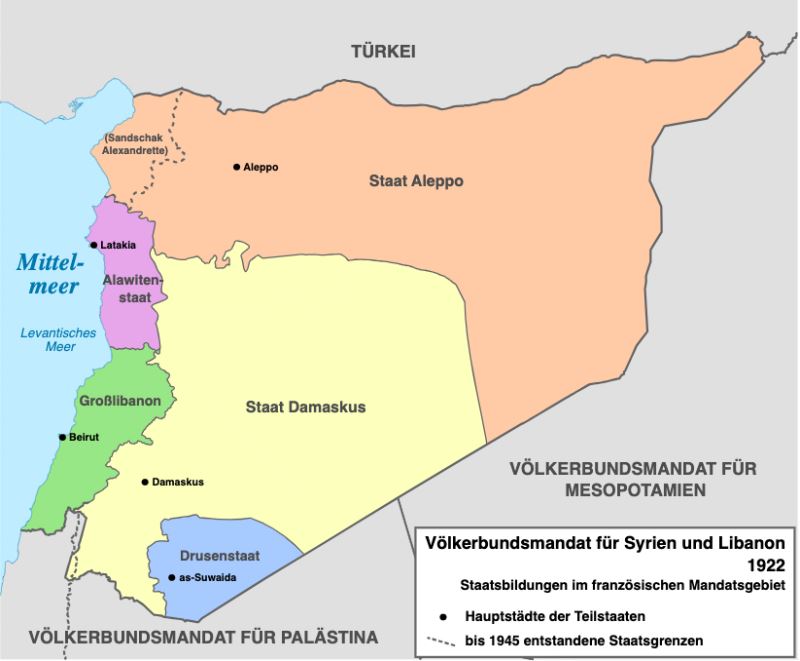 fransızlar, manda yönetimi altındaki bölgeyi beş devlete ayırdı: arap sünnileri, şiileri, kürtleri ve diğer azınlıkları barındıran halep; arap sünnilerden oluşan şam; nusayrileri (alevileri) ve diğer azınlıkları kapsayan lazkiye; hristiyanların yoğunlukta olduğu lübnan; dürzilerin yaşadığı cebel dürzi. iskenderun sancağı ise 1939 yılında türkiye’ye verildi.