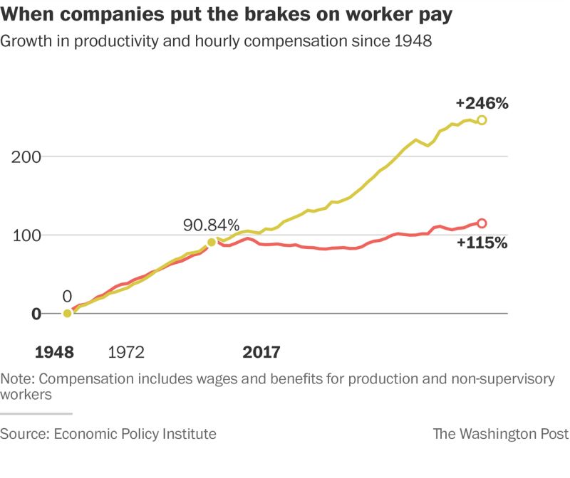 bir yere kadar üretim ve maaşlar elele gitmiş, sonra üretim artarken maaşlar sabit kalmış, değil mi? hah, o işte reagan'ın eseri. türkiye'deki grafik de aynı şekilde, hatta bundan daha da kötü.