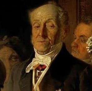 huzurevinden yeni çıkmış gibi. göğsündeki aziz vladimir nişanı soylu olduğunun bir kanıtı. zengin ve statü sahibi bir bunak, parası ile her şeyi elde eder alt metni ile bezenmiş bir figür. yanındaki kadın sanki onun için bir savaş ganimeti. sanki birazdan parçalayacağı bir av hayvanı. boş gözlerle, yanındaki kadına bakışları mükemmel tasvir edilmiş. o dönemde kadının bir obje, eşya gibi görülmesinin somut bir örneği: